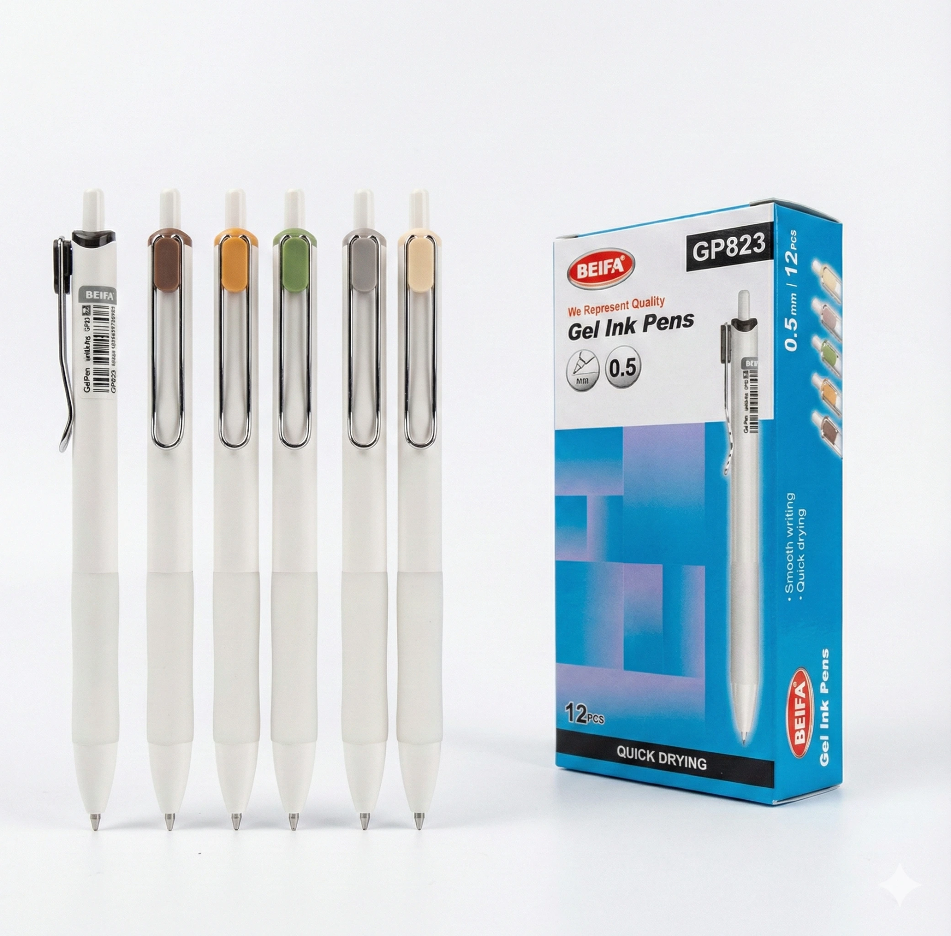 قلم جيل عالي الجودة من بيفا، موديل GP823-01B7، مصمم لتوفير تجربة كتابة دقيقة وسلسة تناسب الاستخدام اليومي في المدارس والمكاتب. يتميز بحبر أسود سريع الجفاف يقلل من التلطخ ويحافظ على نظافة الورق، مما يجعله مثاليًا للكتابة السريعة وتدوين الملاحظات، خاصة لمستخدمي اليد اليسرى. يأتي بسن 0.5 مم يمنح خطًا رفيعًا وواضحًا يساعد على كتابة منظمة واحترافية، مع تدفق حبر متوازن وأداء ثابت دون تقطيع. التصميم العملي يوفر قبضة مريحة تقلل من إجهاد اليد أثناء فترات الكتابة الطويلة.