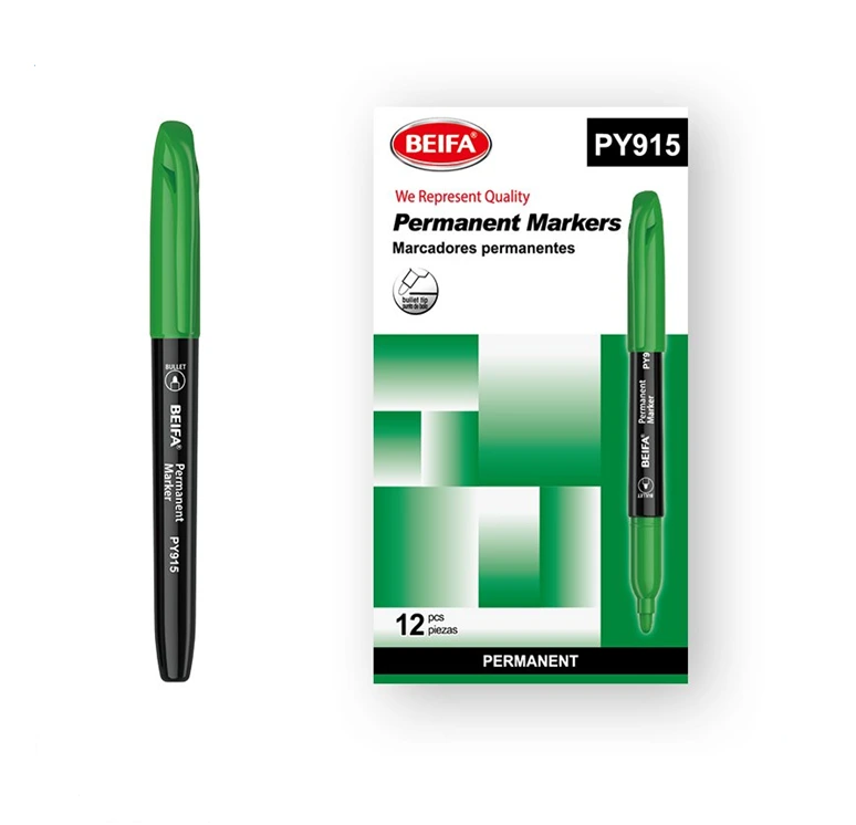 قلم ماركر دائم عالي الجودة من بيفا، موديل PY915-04B7، مصمم للكتابة الثابتة والواضحة على مختلف الأسطح. يتميز بحبر أخضر دائم سريع الجفاف يضمن كتابة ثابتة وواضحة، مع سن مدور يوفر تدفق حبر متوازن وخطًا منتظمًا. الماركر مثالي للاستخدام على الورق، الكرتون، البلاستيك، الزجاج، والمعادن، مما يجعله مناسبًا للاستخدام المكتبي، المدرسي، والصناعي الخفيف. تصميمه المريح يوفر تحكمًا ممتازًا أثناء الكتابة لفترات طويلة.