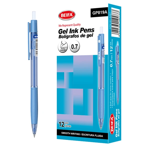 قلم جيل عالي الجودة من بيفا، موديل GP819A-02B7، مصمم لتقديم تجربة كتابة سلسة وواضحة تناسب الاستخدام اليومي في المكاتب والمدارس. يتميز القلم بحبر أزرق سريع الجفاف يقلل من التلطخ ويحافظ على نظافة الورق، مما يجعله مناسبًا للكتابة السريعة وتدوين الملاحظات، خاصة لمستخدمي اليد اليسرى. يأتي بسن 0.7 مم يوفر خطًا أوضح وأكثر سماكة لسهولة القراءة، مع آلية سوستة (ضغط) عملية تضمن سهولة الفتح والإغلاق وسرعة الاستخدام، التصميم المريح للقلم يساعد على تقليل إجهاد اليد أثناء فترات الكتابة الطويلة، مما يجعله خيارًا عمليًا للاستخدام المستمر.