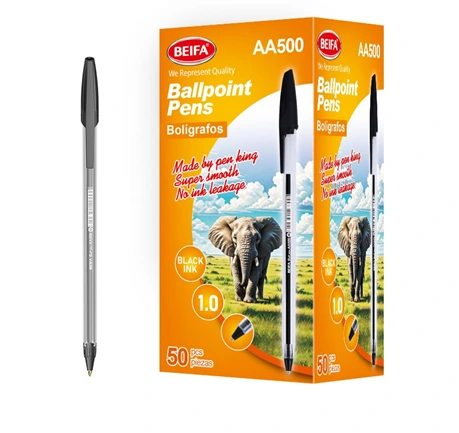 A high-quality ballpoint pen from Beifa, Model AA500-50B, designed to provide a smooth and clear writing experience suitable for daily use in offices and schools. The pen features dense, consistent black ink that ensures clear lines without skipping during writing. With a 1.0 mm tip, it offers an ideal balance between smooth ink flow and line precision. The pen comes with a practical, ergonomic design that reduces finger fatigue during long writing sessions, making it a reliable choice for office and academic work.