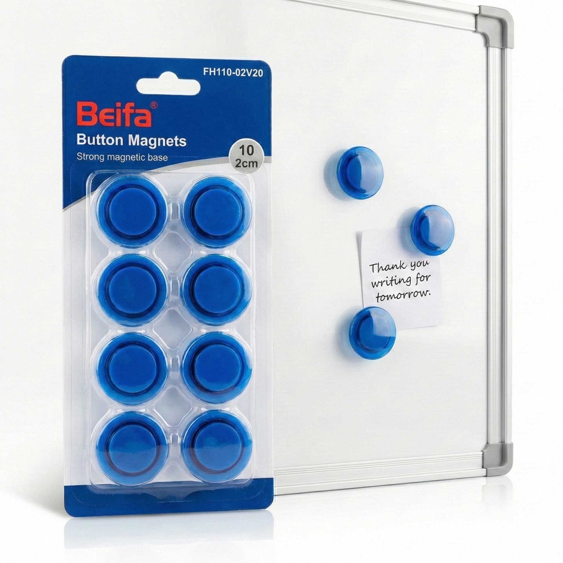 أضف لمسة احترافية لمكتبك مع طقم مغناطيس بيفا (Beifa) الدائري باللون الأزرق. عبوة اقتصادية تحتوي على 10 قطع بقطر 2 سم (20 مم). مثالي لتثبيت الملاحظات والتقارير بقوة على السبورات البيضاء والأسطح المعدنية دون خدشها."