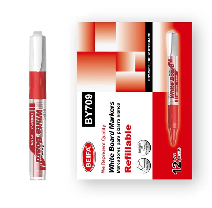 Marcador de pizarra blanca de alta calidad Beifa, modelo BY709-03B7, diseñado para el uso diario en pizarras blancas en escuelas, oficinas y salas de formación. Cuenta con tinta roja intensa y clara que ayuda a resaltar títulos, avisos y notas importantes, junto con una punta redonda que garantiza un flujo de tinta uniforme y una escritura continua sin interrupciones. Es recargable, lo que lo convierte en una opción económica y práctica para un uso repetido. Su diseño cómodo reduce la fatiga de la mano durante sesiones prolongadas de escritura o presentación. Se borra fácilmente y no deja residuos, manteniendo la pizarra limpia y las presentaciones claras.